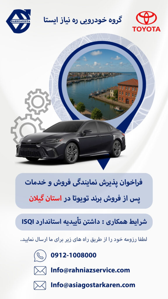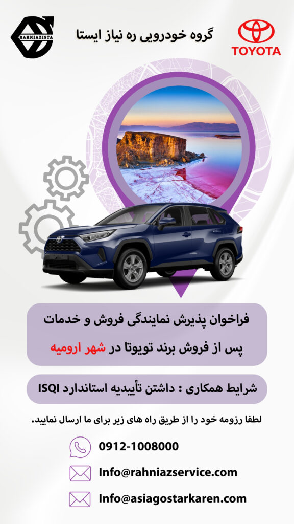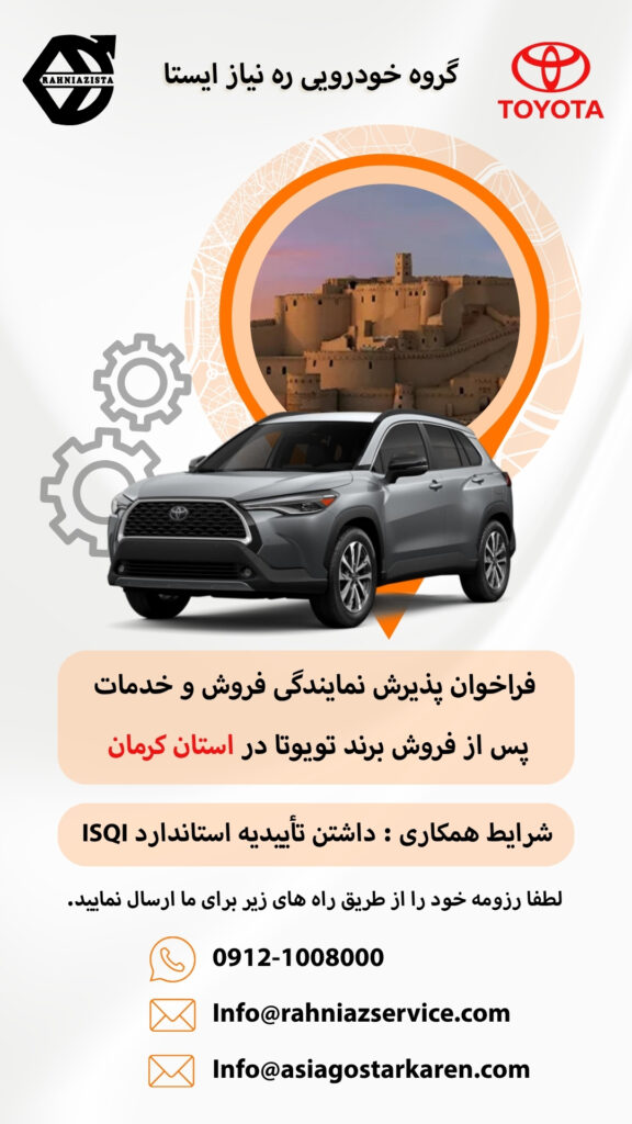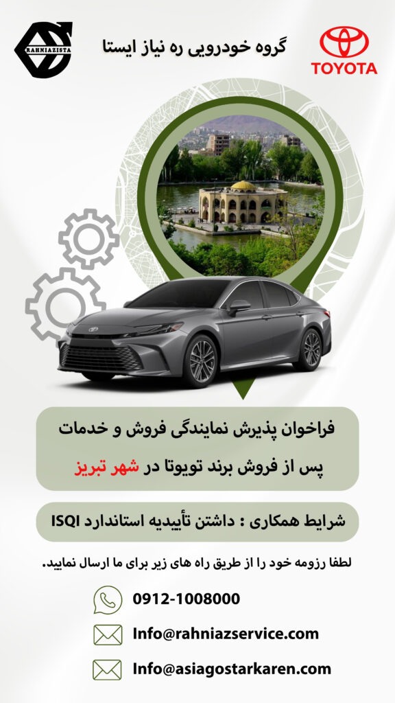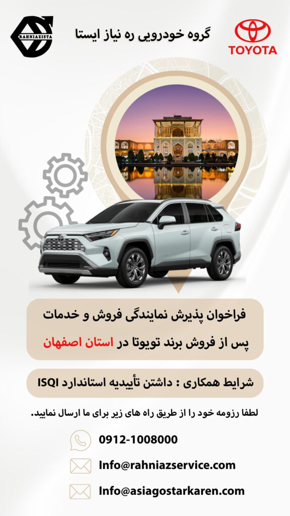شرکت گروه خودروسازی ره نیاز ایستا، نماینده فروش و خدمات خودروهای تویوتا در ایران، با افتخار فراخوان پذیرش نمایندگی خود را اعلام می‌کند. اگر شما علاقه‌مند به همکاری  هستید، این فرصت ویژه را از دست ندهید. ما به دنبال نمایندگانی متعهد، متخصص و باتجربه در زمینه فروش و خدمات خودرو هستیم که بتوانند خدماتی باکیفیت به مشتریان ارائه دهند.